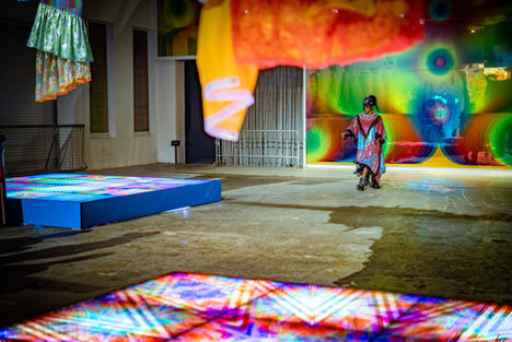 MX Oops activated the exhibition POWER FULL BECAUSE WE'RE DIFFERENT by artist, Jeffrey Gibson in the Massachusetts Museum of Contemporary Art's Building 5. The event began with a sound bath using crystal and metal singing bowl, gongs, and guided meditation. The second portion of the event moved to the other side of a large reflective wall for a dance and rap performance followed by a DJ set.
